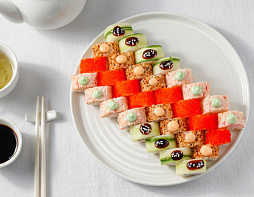 Окунь темпура, японский омлет, огурец,сливочный сыр, имитация икры