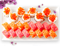 Копченый лосось, темпура, лосось жареный в соусе Терияки, майонез.