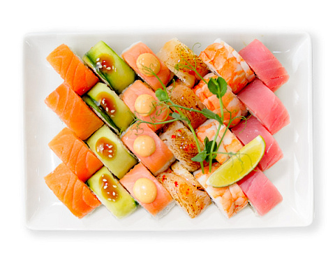 Морской окунь, сливочный сыр, огурец, соус Чили сладкий.